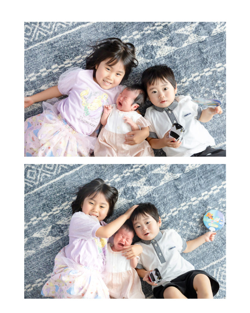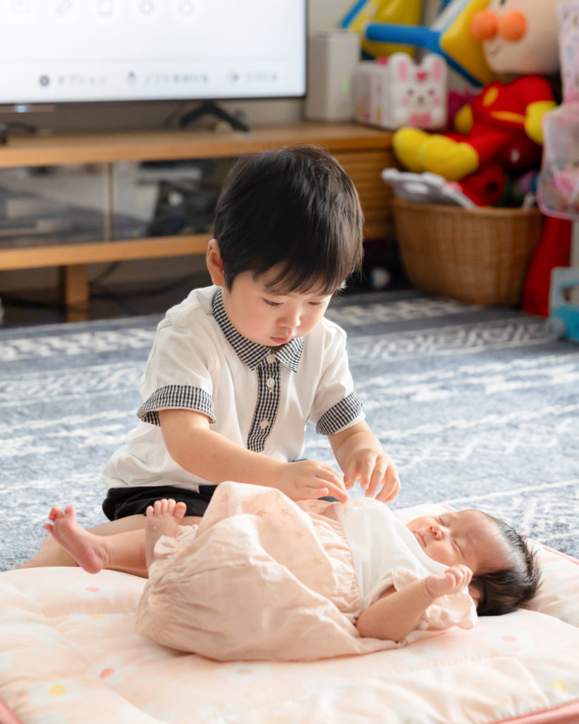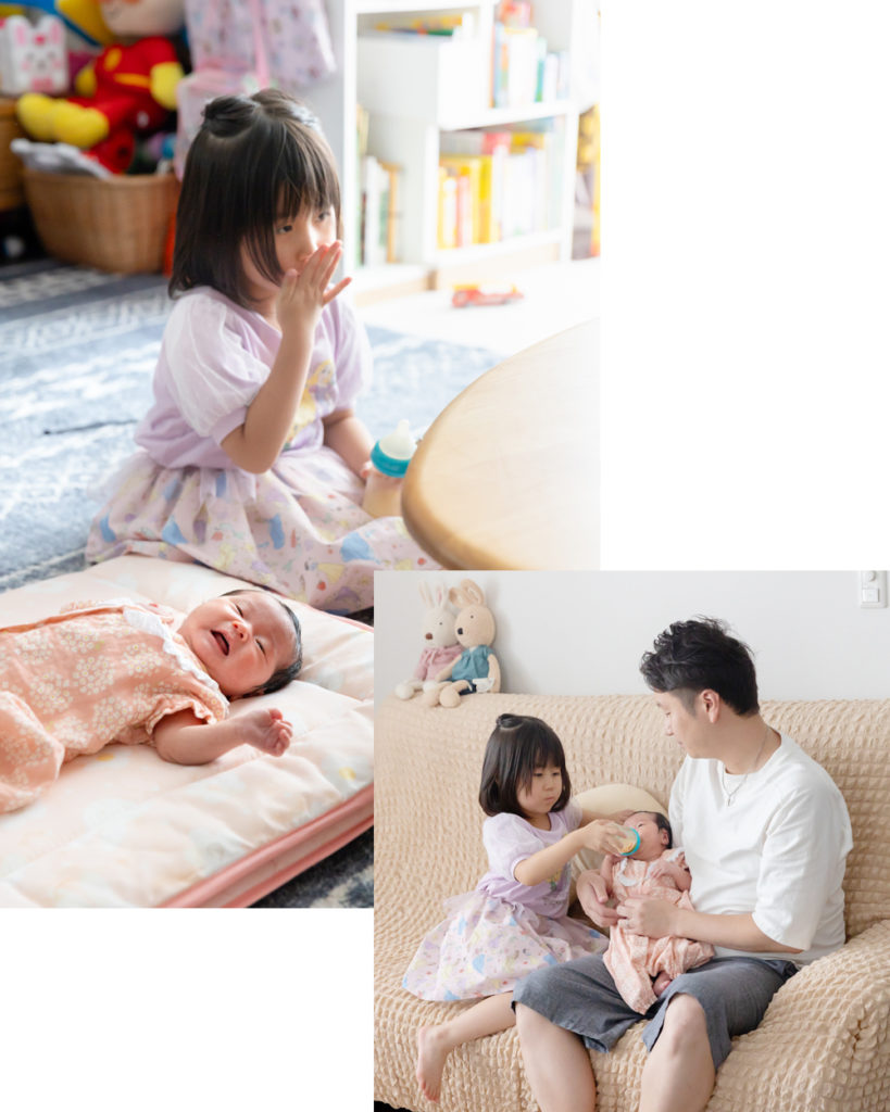 上のお子さんがやきもちを焼いてぐずる様子、ベビーがお腹がすいて泣いている様子、慣れない抱っこ…