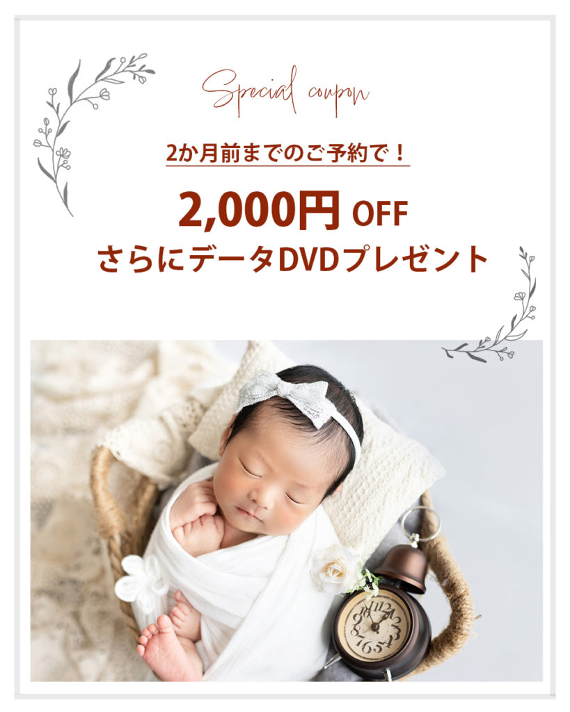 おすすめは出産予定日を基準に生後8~12日あたりです。万が一双方の体調不良で延期しても早めの時期にお撮影が組めます!産後のお問合せも可能ですが、産後のやりとりはとても負担となるかと思います。可能な限り出産前のお問合せがおすすめです。